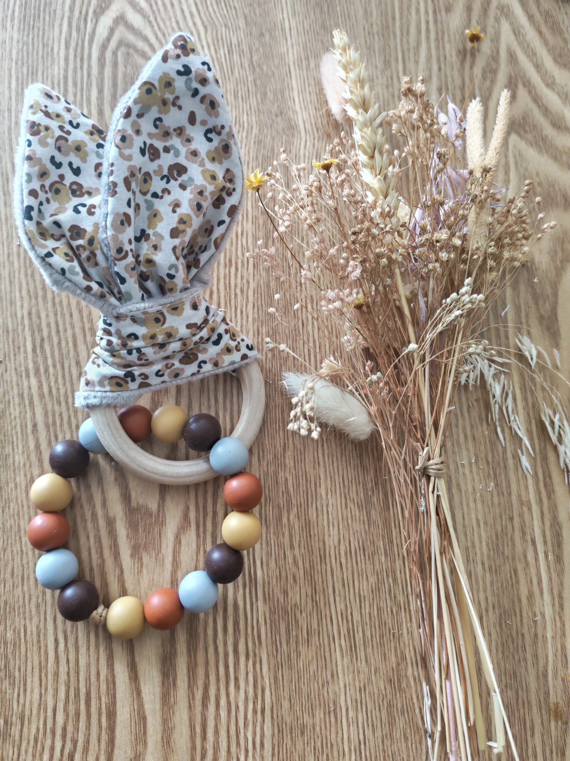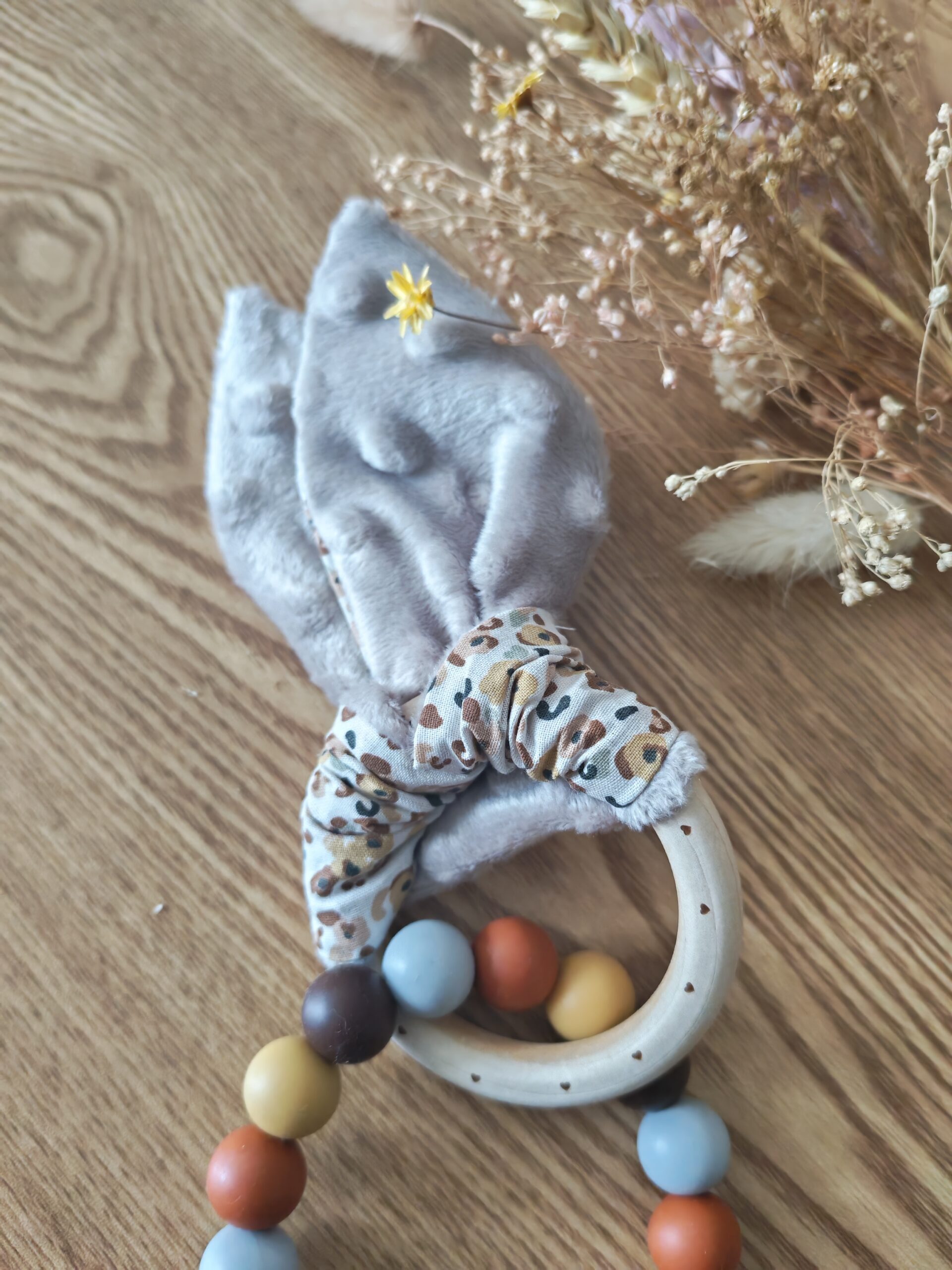 Perles en silicone alimentaire et mordant en bois de hêtre naturel idéal pour soulager les quenottes de bébé.
