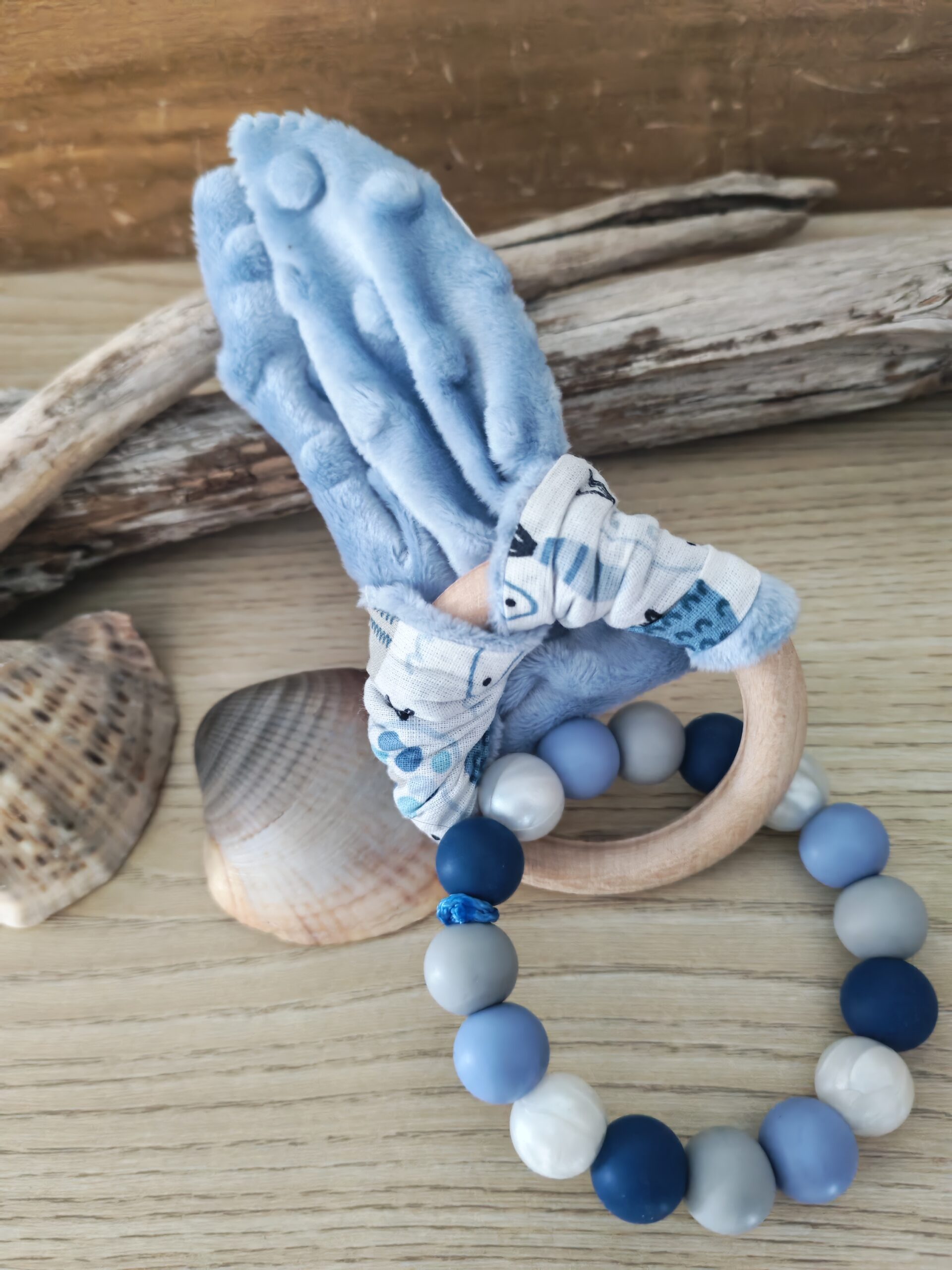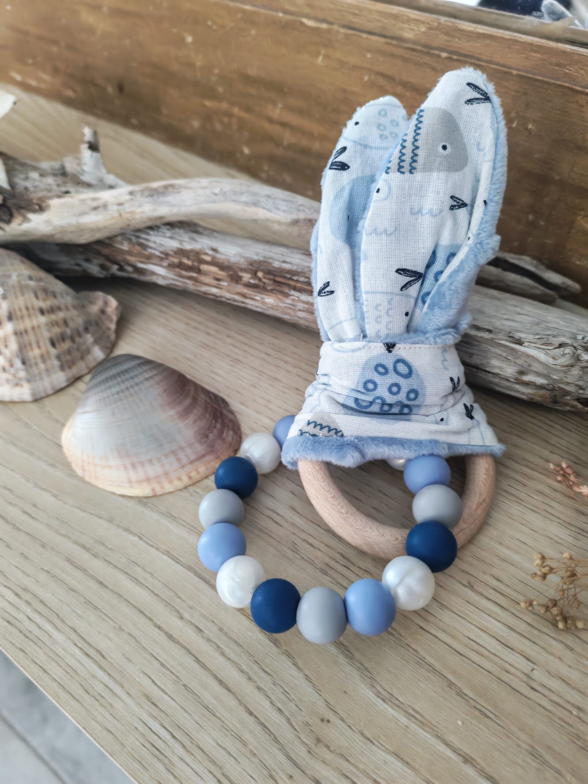 Perles en silicone alimentaire et mordant en bois de hêtre naturel idéal pour soulager les quenottes de bébé.