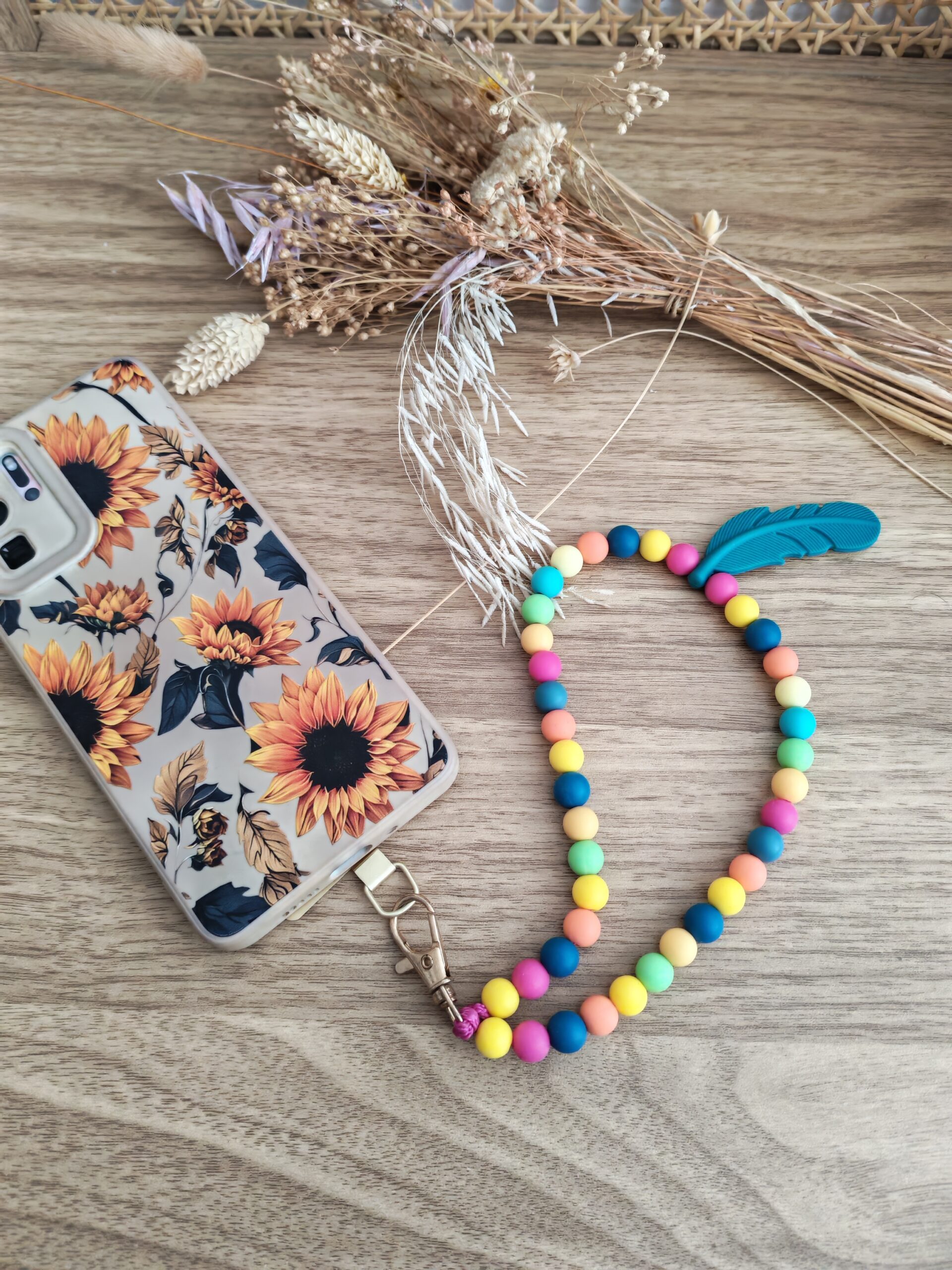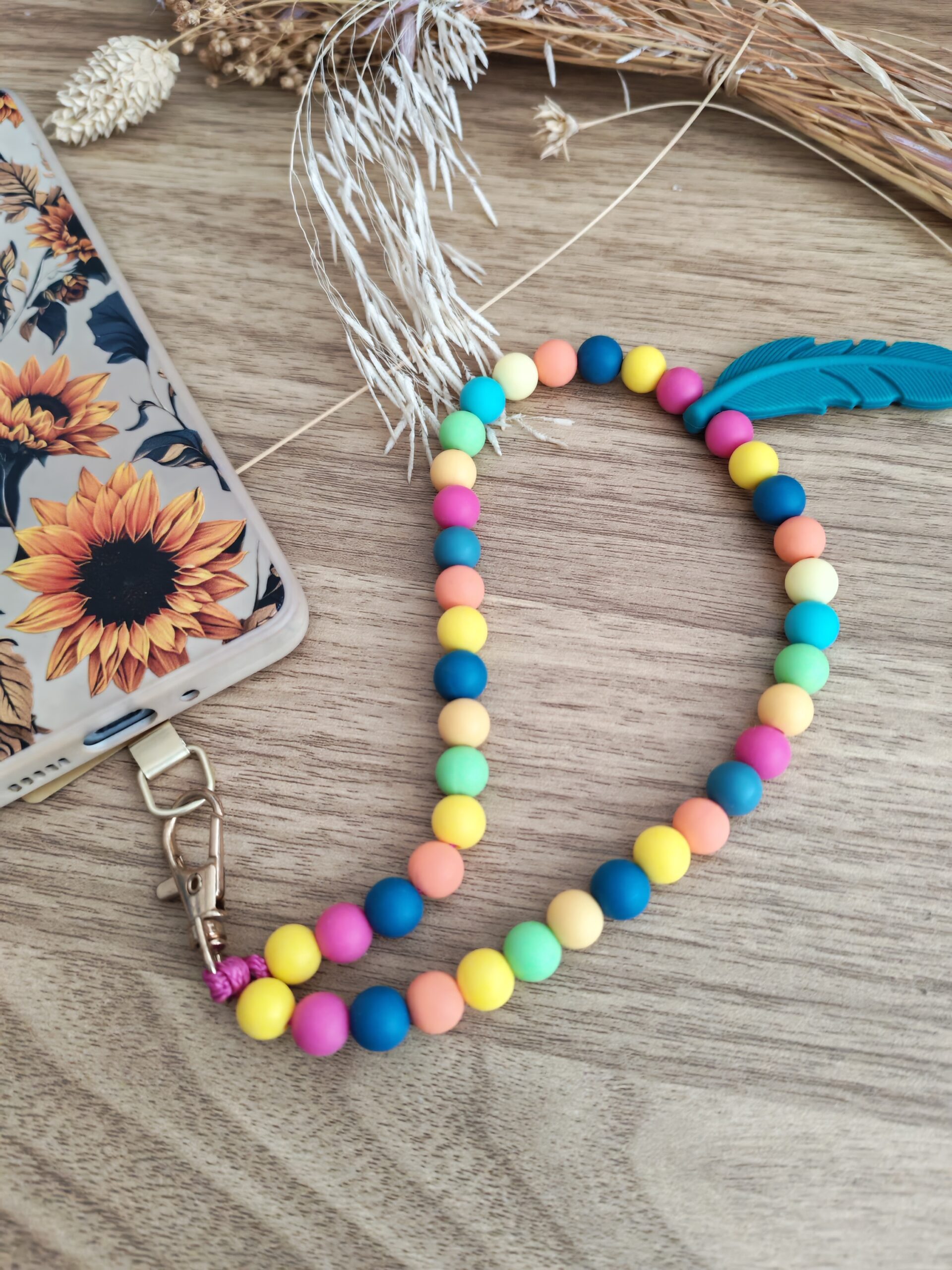 L’accessoire est orné d’un joli pendentif en forme de plume, ajoutant une note bohème et raffinée. Son mousqueton  permet d’attacher facilement votre téléphone grâce a votre coque , tout en offrant une prise en main agréable.