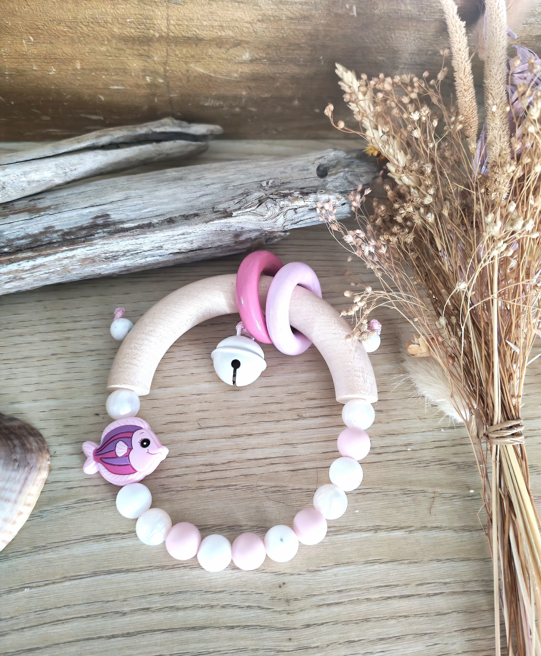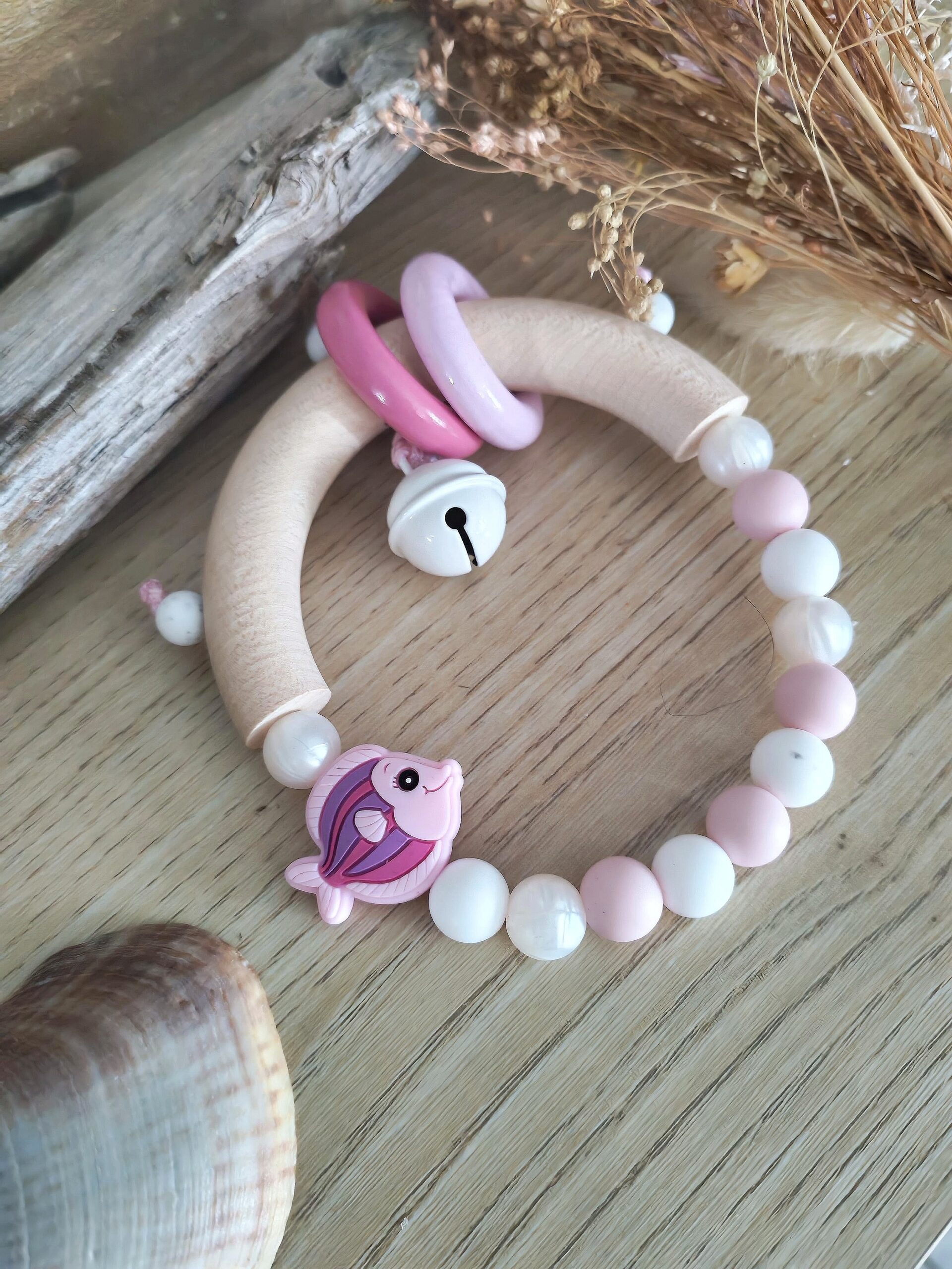 bébé peut s’éveiller grâce au doux son du grelot tout en soulageant ses poussées d’dentaire grâce au bois de hêtre naturel et des perles en silicone alimentaire .